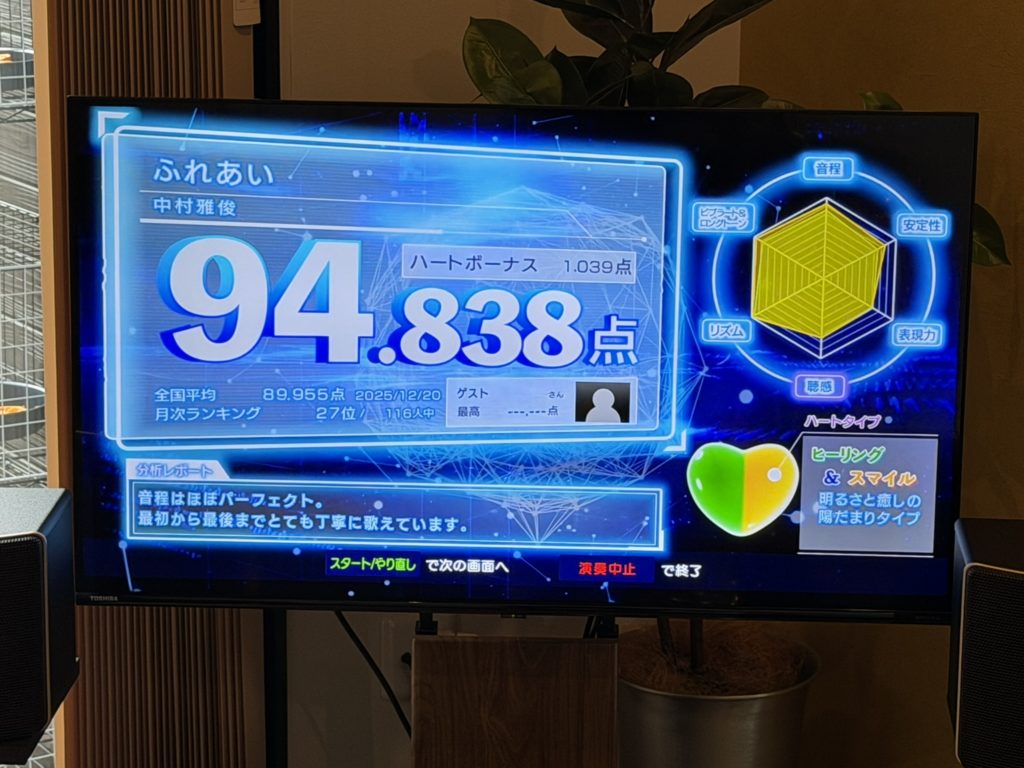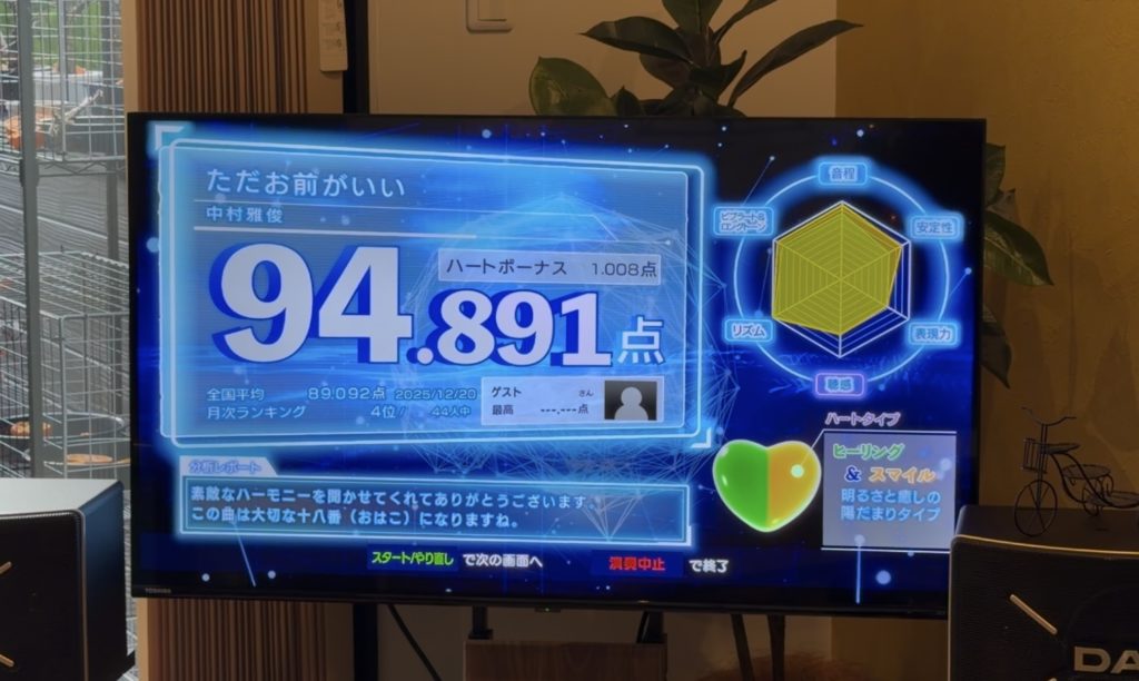 高得点を目指して精密採点に臨んだのですが、95点オーバーは出せませんでした。久しぶりとはいえ、歌唱力が落ちているのを実感、年には勝てないと思いました。