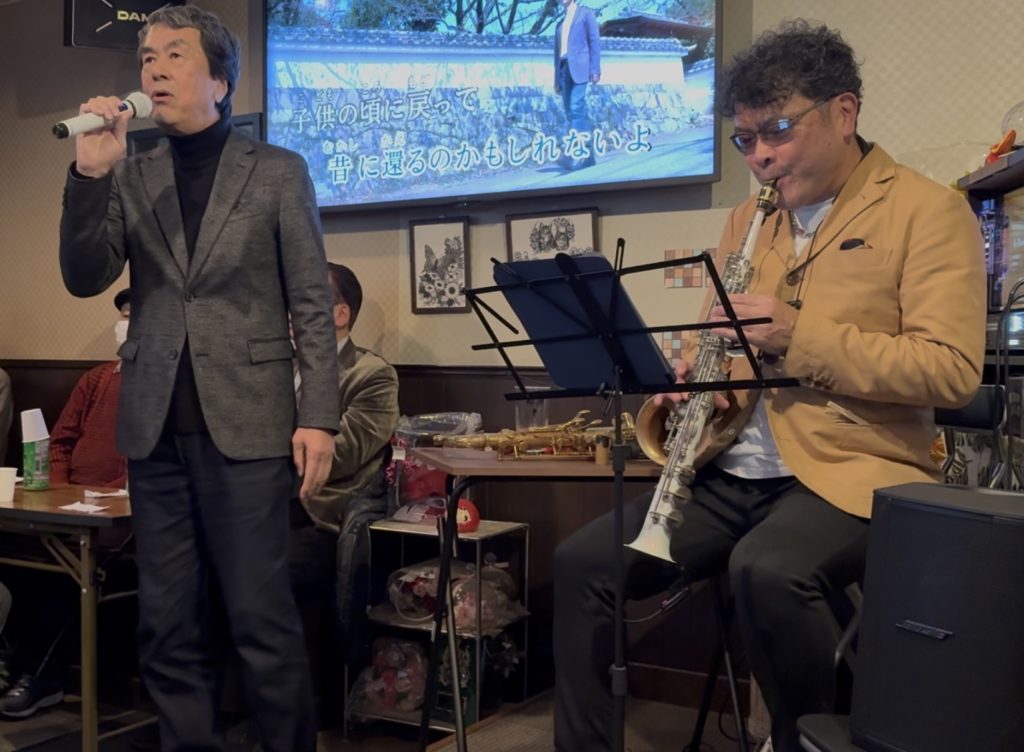 カラオケ+万輝さんのコーラスとサックスの伴奏で歌いましたが、けっこう緊張しました。